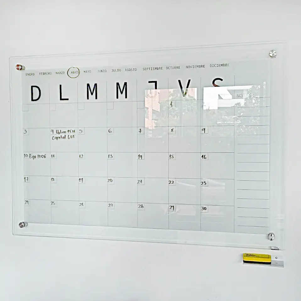 Vidrio templado brillante de 6 mm con dilatadores en acero con película blanca o transparente con diseño. Incluye Portaborrador metálico.